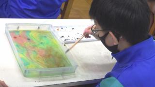 1年の美術の授業では、マーブリング(墨流し)に取り組んでいます。2学期の1年生の授業は、大学院から派遣された実習生が担当しています。