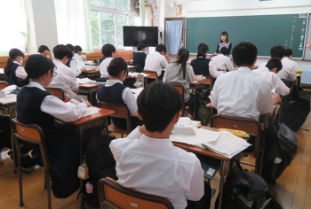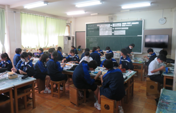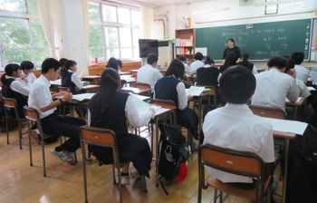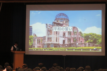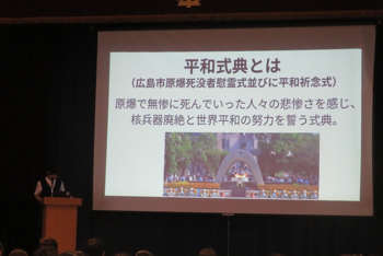 次に、西東京市の「戦後80周年平和大使派遣事業」に応募し、8月5日(火曜日)から7日(木曜日)までの期間広島へ行ってきた生徒から活動の報告がありました。原爆ドーム、平和記念公園、平和記念資料館等の見学や、平和祈念式典へ参加した体験について発表しました。