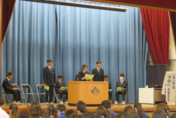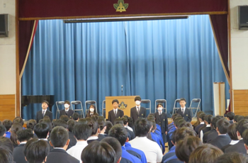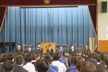 生徒朝会では、生徒会新旧役員の挨拶がありました。