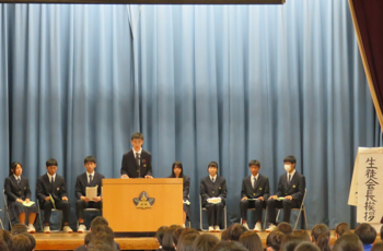 本日1時限目に、生徒朝会・後期生徒総会が開催されました。
