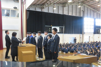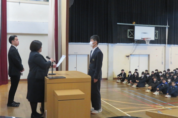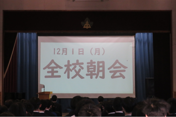 全校朝会終了後、生活指導主任の先生から12月の生活目標等の話がありました。続いて生徒表彰が行われ、卓球部と個人の表彰がありました。