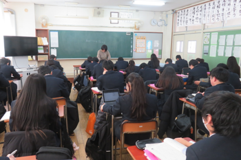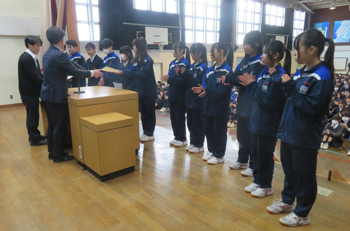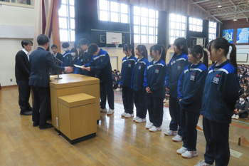 生徒朝会終了後、生徒表彰があり、バドミントン部の生徒たちが表彰されました。