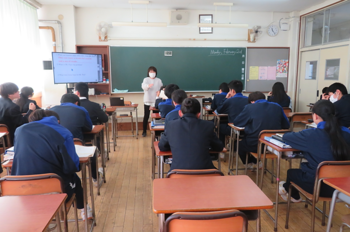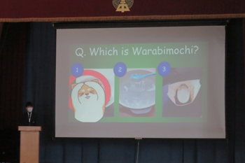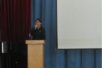 次に、1月28日に行われた「西東京スピーチフェスティバル」(市内中学校の代表生徒が英語で発表する会)に参加された生徒が、全校生徒の前で堂々と発表しました。
