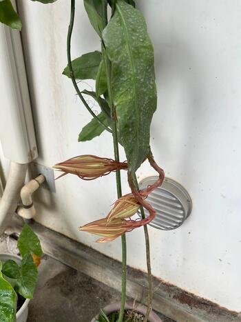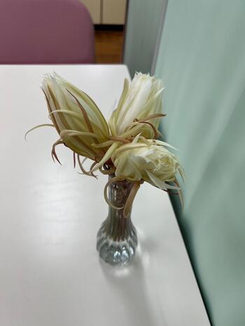 今日から、10月に入りました。気候も秋が感じられるようにもなり、過ごしやすくなりました。保健室の裏で、育てていた月下美人が昨日の夜に開花した様子がありました。月下美人は、一晩だけ咲く一夜花のため、残念ながら一番きれいな瞬間を見ることはできませんでしたが、それでも大きな花を咲かせた様子はうかがえました。