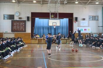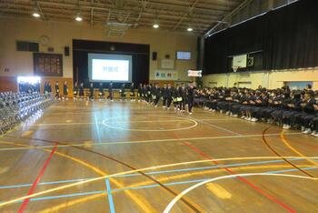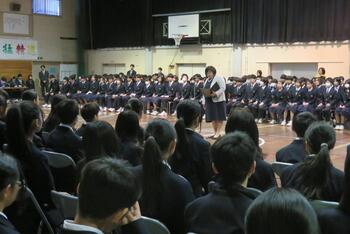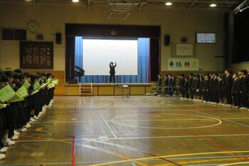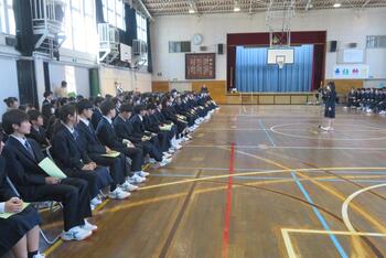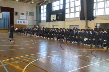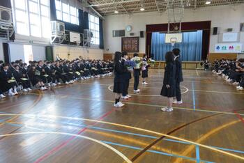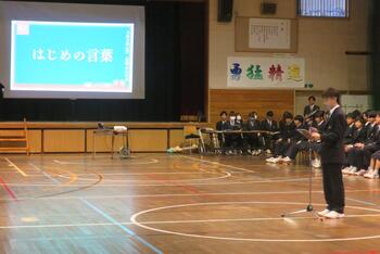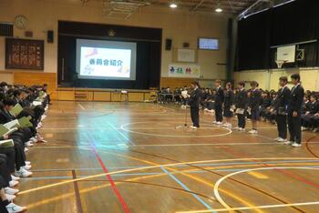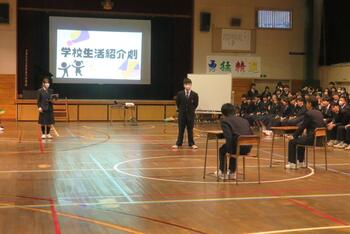 今日は、対面式を行いました。緊張した面持ちで入場する1年生を温かい拍手で迎えました。校長挨拶、生徒会長挨拶の他、学校の生活紹介の寸劇やクイズ、部活動紹介などで1年生が中学校生活が楽しみになるような先輩たちの工夫が光りました。これで、1年生も三中の仲間として学校生活がスタートです。
