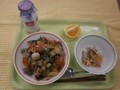 15日(水) 五目あんかけ焼きそば さつまいもと大豆の揚げ煮 ぽんかん 牛乳
