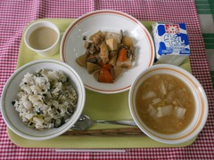 里芋やにんじん、ごぼうなどの根菜類がたっぷり入った味噌汁は、調理員さん達が大量の泥付きの根菜類を手剥きして作っています。こぎつねご飯は、うるち米にもち米を混ぜたおこわ風炊き込みごはんでとても美味しく、大好評でした。