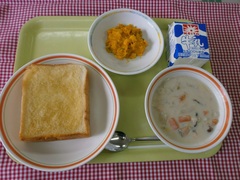 今日は秋鮭の入ったクリーム煮の献立です。なめらかなホワイトソースが野菜や鮭と良く合い、とても美味しく仕上がっていました。どのクラスもほとんど食べ残しなく、よく食べていました。