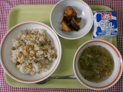 畑のお肉とも呼ばれる、たんぱく質豊富な大豆が入った混ぜごはんです。苦手な生徒も多いししゃもですが、青のりの入った衣をつけて揚げた磯揚げは好評でした。
