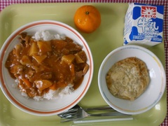 ハヤシライスは小麦粉をバターで炒めて、ブラウンルーから作ります。豚肉、玉ねぎ、セロリ、にんじん、じゃがいも、マッシュルームなどの具在に、豚骨スープ、赤ワイン、トマトピューレ、ウスターソース、ケチャップなどを加えて、仕上げます。どのクラスもよく食べていました。