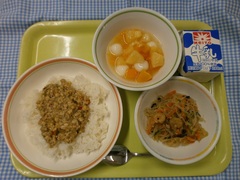 今日はタイ料理です。給食ではガパオライスに目玉焼きをのせることができませんが、ナンプラーとバジルを使って、タイ料理風の味付けにしました。ヤムウンセンは海老の入った春雨サラダです。にんにくをすりおろし、生のレモンを絞って爽やかな酸味を加えました。