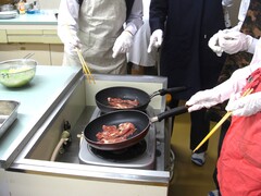 ちょうどお肉を焼く時間の様子です。お肉の焼き加減を確認しながら丁寧に作っていました。