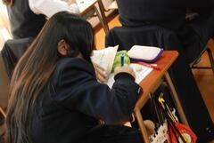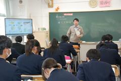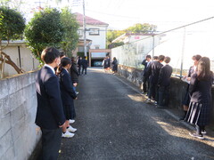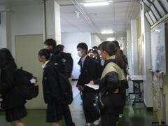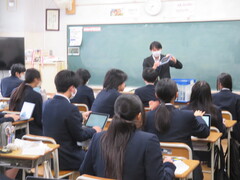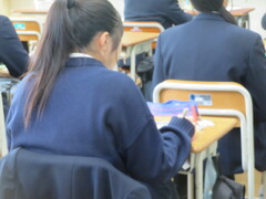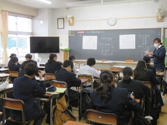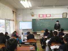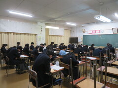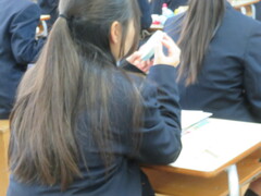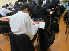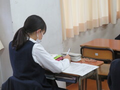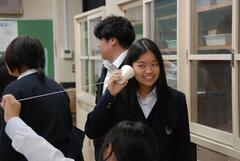 今日の授業の様子です。社会科は国会での予算の成立過程や公共料金についてです。理科は実験です。コップを冷やして結露する温度を測ろうとする試みです。家庭科の授業は縫いぐるみの製作の初期段階です。体育は走り高跳びです。みんな寒さにめげずに頑張ってください。このように淡々と授業が進む期末考査直前の一日でした。