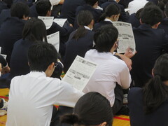 全校朝礼では、今月の学校だよりと合わせて、校長先生のお話に耳を傾けていました。