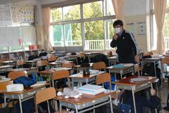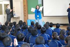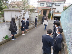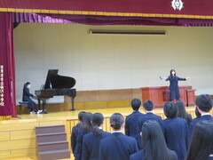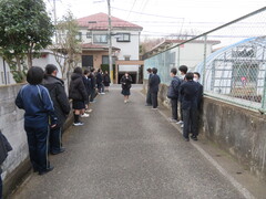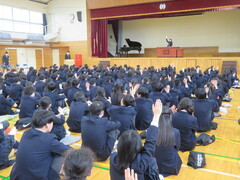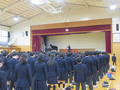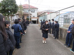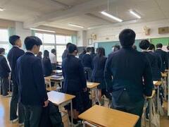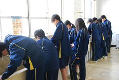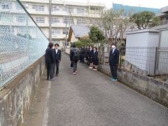 15年前の今日、今の生活は、当たり前ではないことを忘れずに日々の生活に感謝の気持ちをもって一日一日を大切に過ごしたいと生活指導主任から話があり、亡くなられた方々のことを思いながら、黙とうしました。3年生は、卒業式練習が始まっています。昨年度の入退場の様子をビデオで見てから練習に入りました。