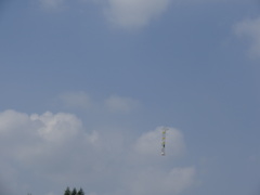 ペットボトルで作ったロケットの中に、水と空気を入れて圧力で飛ばします。「3.2.1」とみんなで声をかけて、勢いよく高く飛び、3回目でパラシュートが開いて地上につきました。