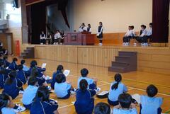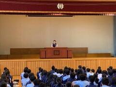 校長先生のお話の後、全校生徒で校歌を歌い、
